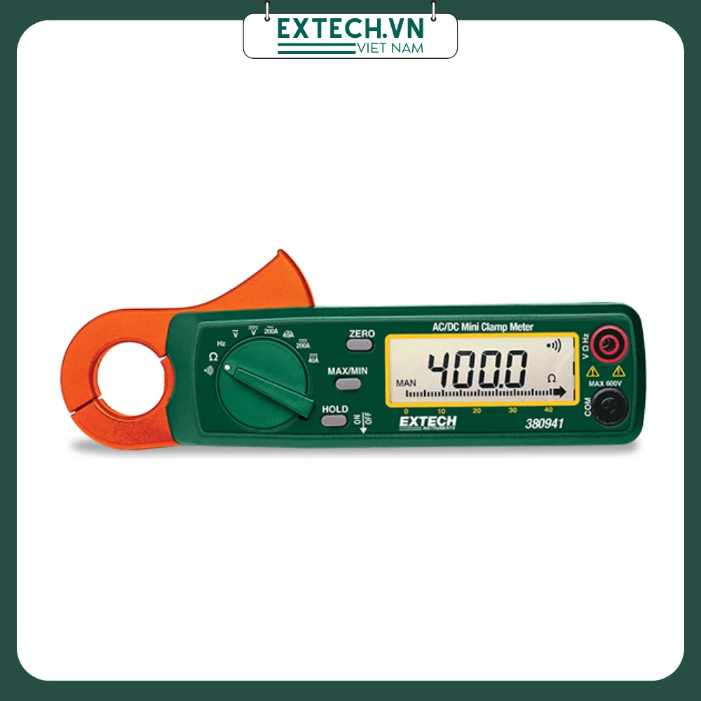 Ampe kìm Extech 380941 hữu ích cho các nhiệm vụ khắc phục sự cố trong bảo trì nhà máy, điện, HVAC và công việc viễn thông, cũng như điện gia dụng, bảo trì đội tàu, hàng hải và sửa chữa xe máy. 380941 có xếp hạng an toàn CAT III 300 Volt và bảo hành một năm. Đi kèm với pin và sách hướng dẫn.