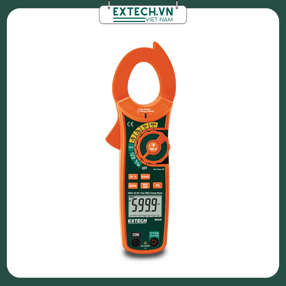 Extech MA640 600A là dòng Ampe kìm True RMS với nhiều công nghệ như. Bảo dưỡng thực vật, khắc phục sự cố điện và các thiết bị DIY. Một công cụ thử nghiệm mang lại hiệu suất và giá trị cao. Ngoài ra, Ampe kìm Extech MA640 còn có các khả năng đo như một đồng hồ vạn năng và đo dòng điện tiên tiến. Nó còn có đầu dò điện áp không tiếp xúc (NCV) tích hợp sẵn.