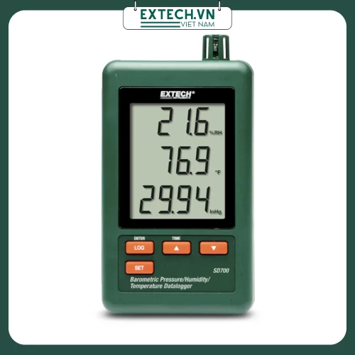 Extech SD700 ghi dữ liệu vào thẻ SD ở định dạng Excel. Hiển thị áp suất khí quyển ở 3 đơn vị đo: hPa, mmHg và inHg. Màn hình LCD ba màn hình hiển thị đồng thời áp suất khí quyển, nhiệt độ và độ ẩm tương đối. Bộ ghi dữ liệu ghi lại ngày/giờ và lưu trữ các số liệu đo trên thẻ SD ở định dạng Excel để dễ dàng chuyển sang máy tính. Tốc độ lấy mẫu dữ liệu có thể lựa chọn từ 5, 10, 30, 60, 120, 300, 600 giây. Bao gồm (6) pin AAA, thẻ nhớ SD, bộ chuyển đổi AC đa năng và giá đỡ.