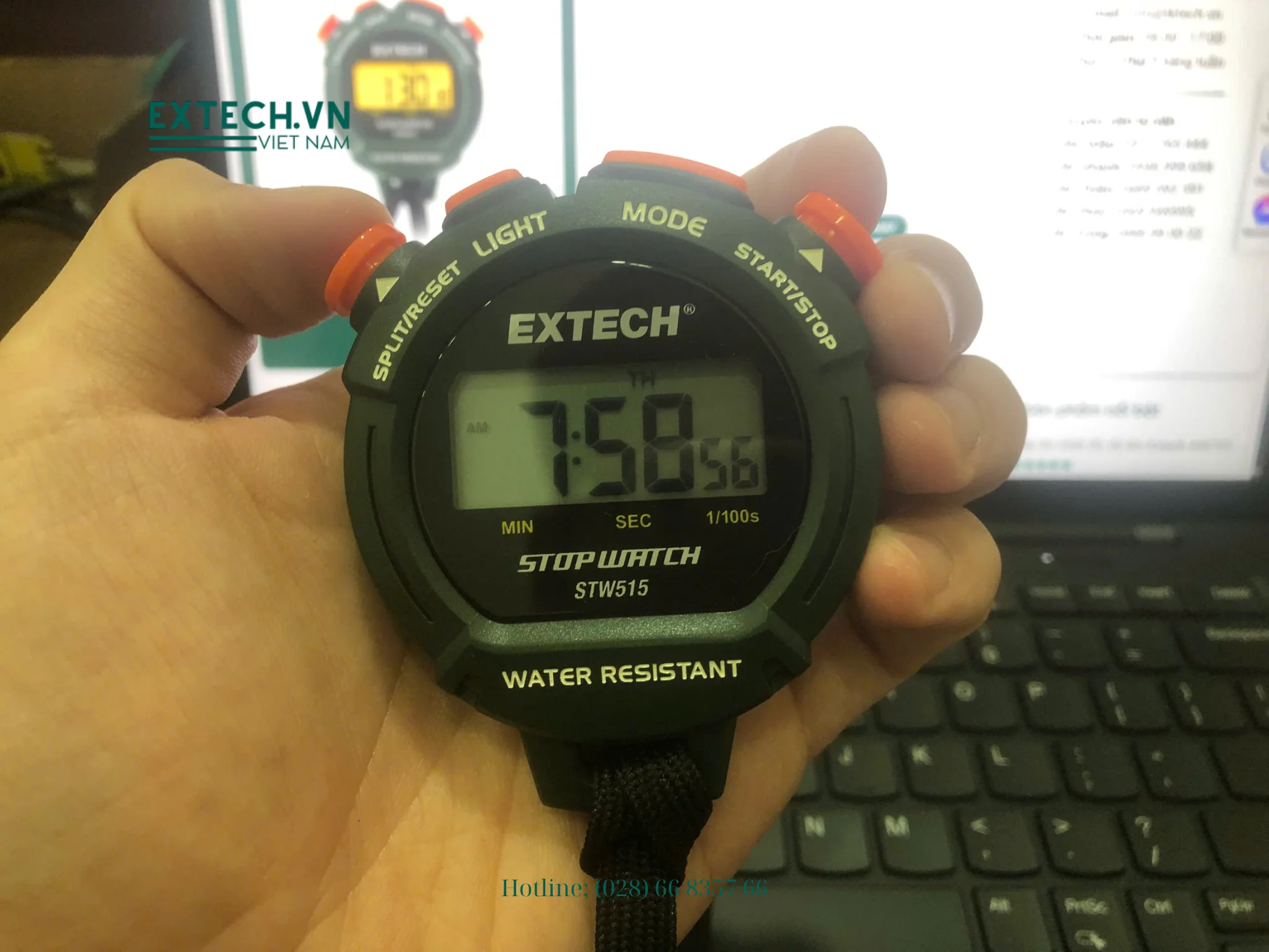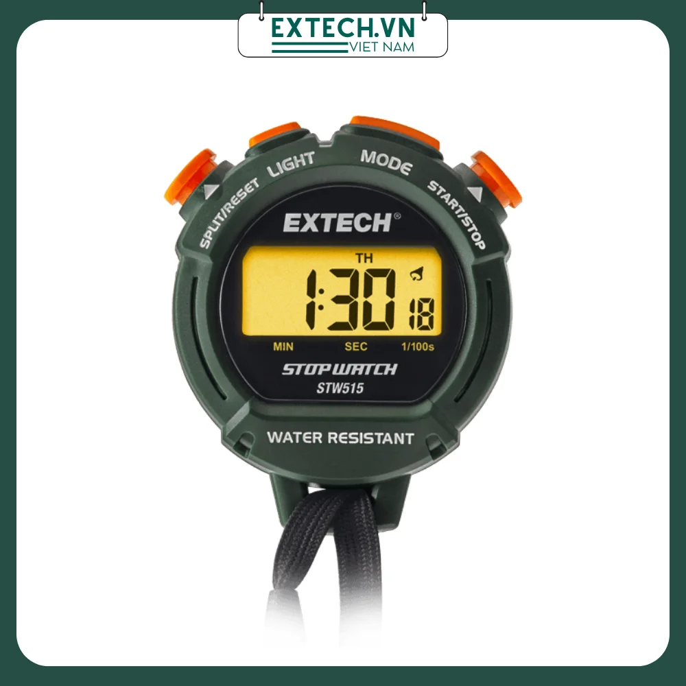 Đồng hồ bấm giờ và đồng hồ Extech STW515 với màn hình có đèn nền là đồng hồ bấm giờ và đồng hồ kỹ thuật số. Đồng hồ bấm giờ này có định dạng đồng hồ 12 hoặc 24 giờ và báo thức lập trình với chuông báo giờ. Nó cũng có ba chế độ Đồng hồ bấm giờ: Hẹn giờ trôi qua, Thời gian phân chia và Hai chế độ hẹn giờ đối thủ. Đèn nền có thể được sử dụng để xem vào ban đêm hoặc trong khu vực thiếu sáng và tự động tắt sau năm giây. Lịch hiển thị ngày, tháng và ngày trong tuần.