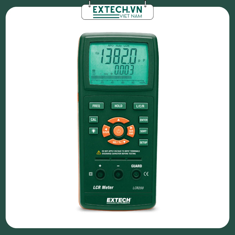 Máy đo LCR đo LCR thụ động Extech LCR200 có màn hình backlit 20.000 / 2.000 đếm ngược của thông số chính (L, C hoặc R) với thông số thứ cấp của Q (chất lượng), D (tản) R (điện trở), θ (pha), hoặc ESR (kháng loạt tương đương). Máy đo LCR Extech LCR đi kèm với bộ kiểm tra tích hợp hoặc sử dụng đầu đo kiểm tra bên ngoài, giao diện RS-232 tích hợp, mở và hiệu chuẩn Ngắn loại bỏ các trở kháng không mong muốn khỏi phép đo và đi kèm với các đầu đo kiểm và pin 9V.