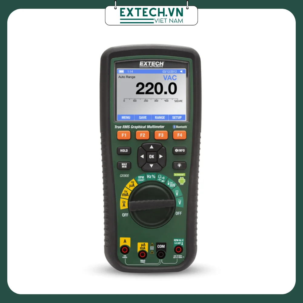 Đồng hồ vạn năng Extech GX900 đồ họa True RMS với Bluetooth truyền các bài đọc điện chính tới các thiết bị di động Android. Chức năng đo dòng điện, điện áp, điện trở, điện dung, tần số, nhiệt độ, chu kỳ nhiệm vụ, độ dẫn, RPM, băng thông ACV và diode liên tục.