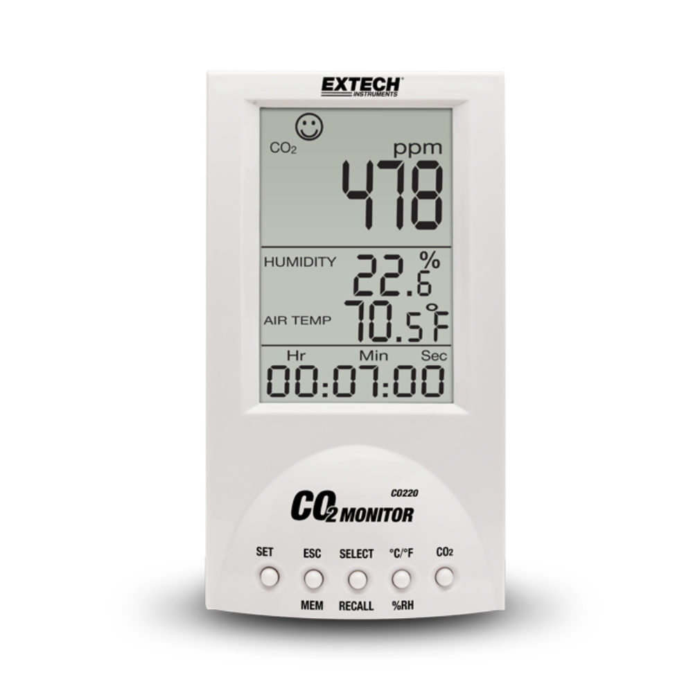 Máy đo chất lượng không khí Extech CO220 đo carbon dioxide (CO2), nhiệt độ không khí và độ ẩm. Máy đo CO2 Extech CO220 cũng tính toán điểm sương và bầu ướt. Sử dụng trong các phòng hội nghị, trường học, nhà kính, nhà máy, khách sạn, bệnh viện và bất cứ nơi nào tạo ra lượng carbon dioxide cao. Tính toán trung bình có trọng số thống kê của TWA (Trung bình có gia quyền theo thời gian 8 giờ) và STEL (Giới hạn phơi nhiễm ngắn hạn trong 15 phút). Cảm biến CO 2 NDIR (hồng ngoại không phân tán) không cần bảo dưỡng . Lưu trữ / gọi lại 99 bài đọc theo cách thủ công. Đi kèm với bộ đổi nguồn AC.