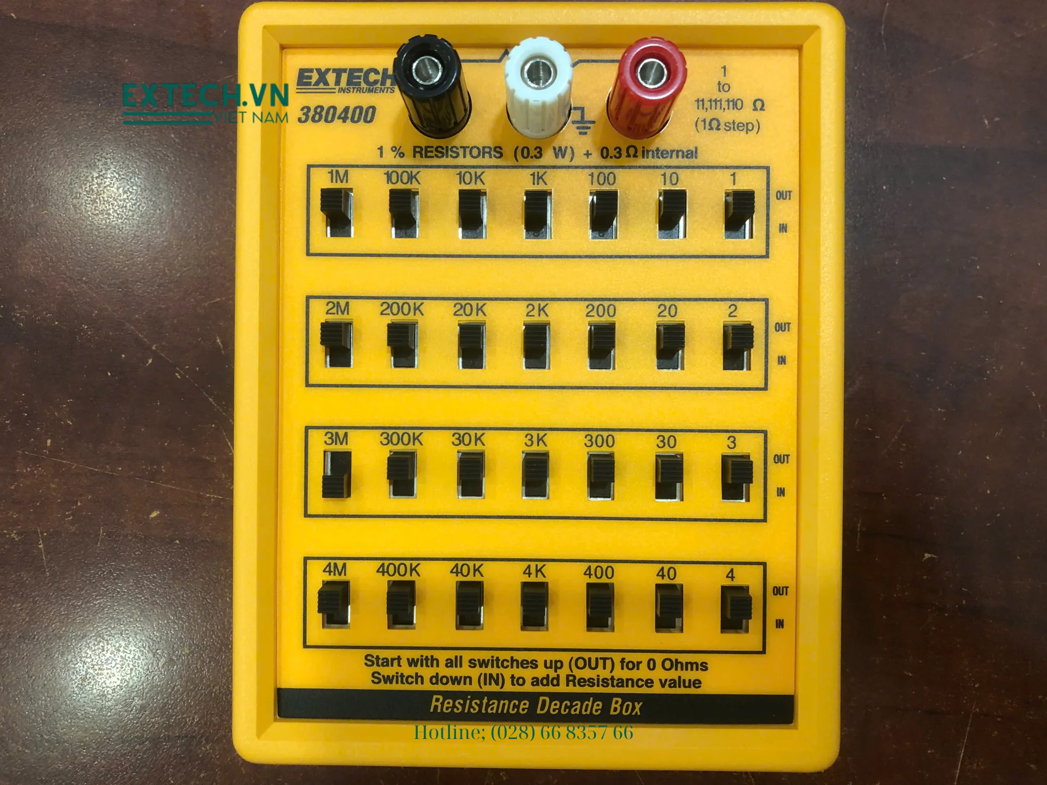 Máy hiệu chuẩn điện trở Extech 380400 có phạm vi điện trở lớn với sai số cực thấp 1%. Phạm vi từ 1 đến 11.111.110Ω; người dùng có thể đặt các giá trị theo gia số 1Ω. Thiết bị được thiết kế cứng cáp, chắc chắn, có vỏ bảo vệ chống sốc. Thiết bị đa năng tiện dụng này rất lý tưởng để thử nghiệm đồng hồ vạn năng chuyên nghiệp, máy đo LCR, bộ hiệu chuẩn, v.v.