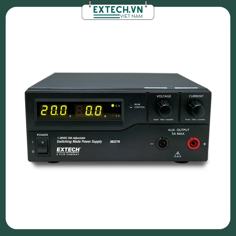 Bộ đổi nguồn Extech 382276 là máy cấp nguồn đa năng sử dụng để chuyển đổi nguồn điện DC có đầu ra điều chỉnh từ 0 tới 30V, dòng điện tối đa 20A. Máy cấp nguồn Extech 382276 cho phép người dùng cài đặt định mức điện áp đầu ra là 13.8V và dòng 20A. Máy có trang bị màn hình LCD kép, hiển thị dòng điện điện áp.