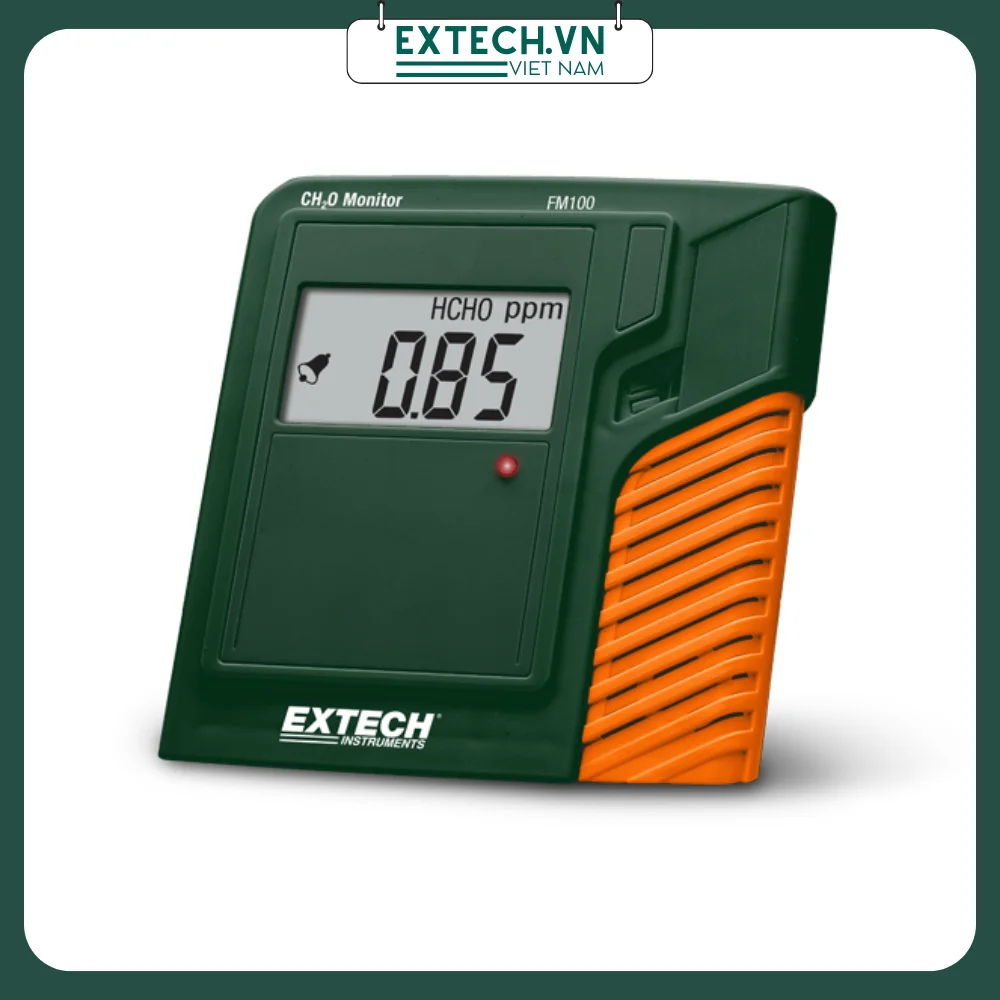 Extech FM100 là màn hình formaldehyde nhỏ gọn trong nhà với chân đế nghiêng. Màn hình hiển thị luân phiên các chỉ số về nồng độ Formaldehyde, Nhiệt độ không khí và Độ ẩm Tương đối, chu kỳ khoảng 6 giây một lần.