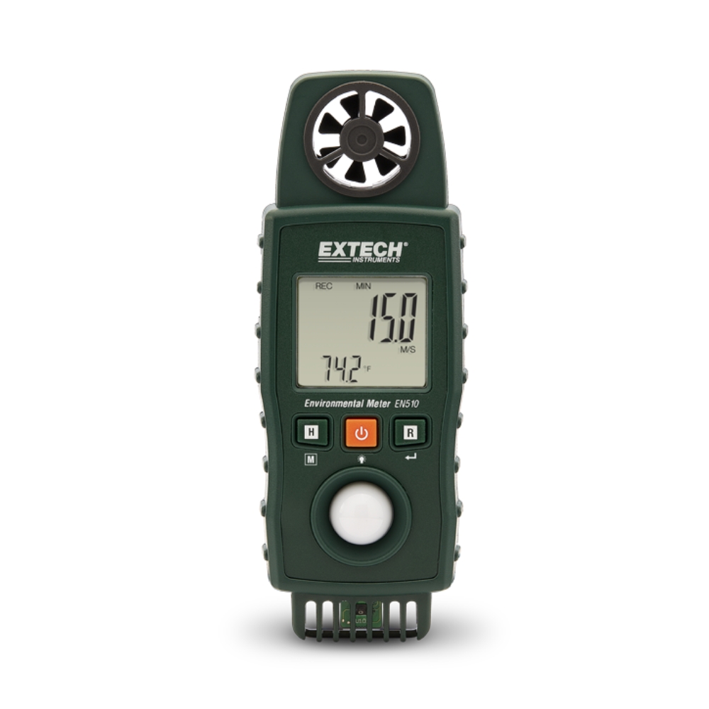 Máy đo môi trường Extech EN510 đo vận tốc không khí, lưu lượng không khí, nhiệt độ không khí, nhiệt độ loại K, chỉ số nhiệt, độ ẩm, bóng ướt, điểm sương, gió và mức độ ánh sáng. Nó có một bánh xe cánh quạt mini có thể thay thế với ổ bi ma sát thấp và cảm biến độ ẩm điện dung cho độ chính xác cao.