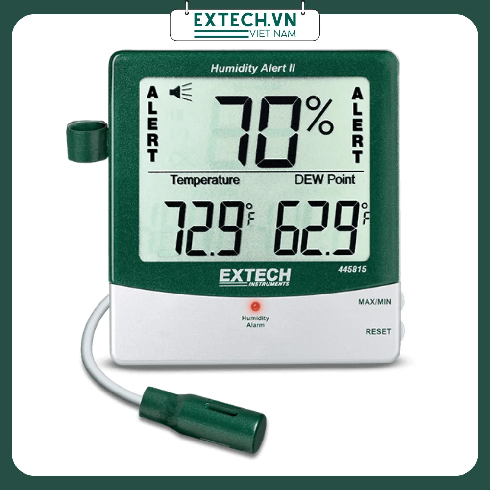 Máy đo độ ẩm với cảnh báo và đầu dò từ xa, hiển thị 3 thông số cùng lúc: độ ẩm tương đối, nhiệt độ và điểm sương. Thiết bị có chân đế để bàn hoặc có thể gắn tường bằng giá đi kèm. Còi báo động âm thanh và đèn cảnh báo khi độ ẩm vượt quá hoặc thấp hơn ngưỡng cài đặt. Chức năng ghi nhớ giá trị tối đa/tối thiểu. Đầu dò từ xa dài 45,7 cm (18 in) cho phép đo phía sau tường hoặc khu vực khó tiếp cận. Lý tưởng để sử dụng trong môi trường ẩm ướt – nơi có nguy cơ nấm mốc.