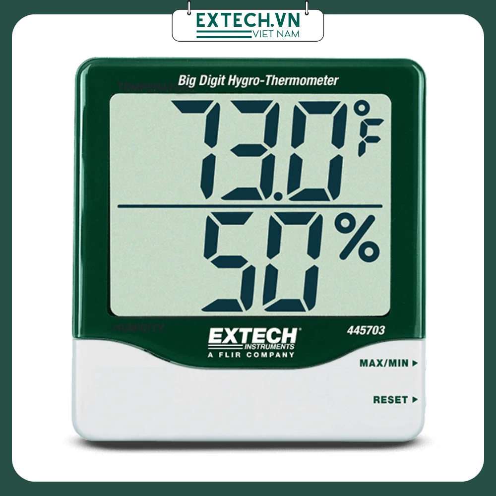 Extech 445703 là nhiệt ẩm kế có màn hình LCD siêu lớn với chữ số cao 1 inch, dễ quan sát. Thiết bị hiển thị đồng thời: