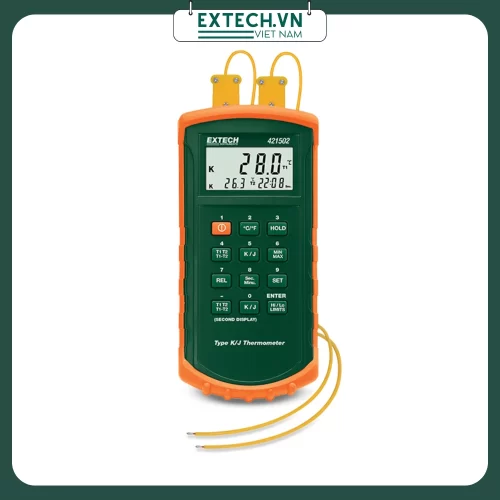 Máy đo nhiệt độ Extech 421502 với đầu vào cặp nhiệt điện loại K/J có màn hình hiển thị kép và cảnh báo âm thanh có thể lập trình ngưỡng cao/thấp. Thiết bị có độ chính xác 0.05%, hỗ trợ các chức năng đo Min/Max/Trung bình, giữ dữ liệu (Data Hold), đo tương đối và đo nhiệt độ vi sai giữa cặp nhiệt điện loại J, loại K hoặc đồng thời cả J và K.