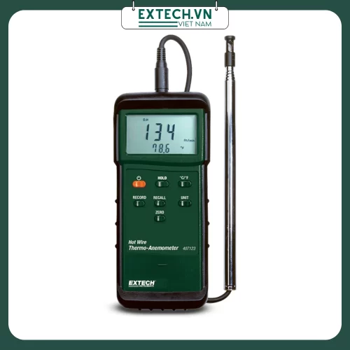 Máy đo lưu lượng và nhiệt độ không khí Extech 407123 (Heavy Duty Hot Wire Thermo-Anemometer) sử dụng đầu dò dạng ống lồng có thể kéo dài tới 60cm, rất lý tưởng để đo trong ống dẫn gió và hệ thống thông gió. Thiết bị cho phép đo tốc độ gió và nhiệt độ không khí chính xác, hiển thị đồng thời trên màn hình LCD kép. Ngoài ra, máy còn có các chức năng Data Hold, đo Min/Max. Bộ sản phẩm đi kèm đầu dò kéo dài với cáp 1,7m và 6 pin AA.
