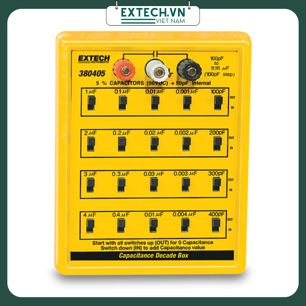 Máy hiệu chuẩn điện dung Extech 380405 rất phổ biến trong thử nghiệm và hiệu chuẩn thiết kế sản phẩm vì nó có thể thay thế vào mạch và hoạt động thay cho bất kỳ thành phần nào có giá trị chuẩn một cách dễ dàng. Ngoài ra, nó có thể được sử dụng để xác định giá trị tốt nhất cho hoạt động của mạch, sau đó đọc giá trị đó từ các công tắc. Sau đó, có thể đưa tụ điện có kích thước được chỉ định bởi các công tắc hộp thập phân vào mạch.