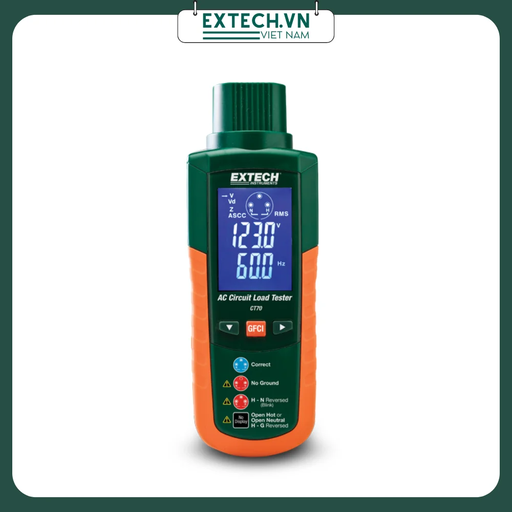 Là một máy đo tải AC, máy đo tải mạch Extech CT70 có thể tải 12, 15 và 20 Amps có thể lựa chọn và đo các điện áp dòng AC nạp và không tải. Các chức năng kiểm tra đầu ra khác bao gồm điện áp mặt đất trung tính, điện trở quá cao, bình thường, và điện trở đất, các lỗi GFCI và hệ thống dây điện mở hoặc đảo ngược.