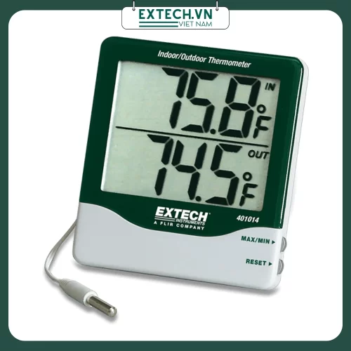 Extech 401014 là Nhiệt kế chữ số lớn hiển thị đồng thời nhiệt độ trong nhà và ngoài trời. Cảm biến chống nước để đo ngoài trời kéo dài trên cáp mỏng 9,6 ft để lắp đặt dễ dàng. Bộ nhớ trong lưu trữ các số đọc Min/Max theo thời gian.