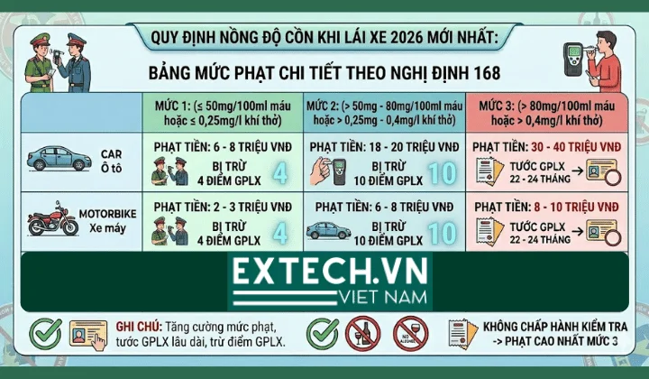Extech Việt Nam sẽ giúp bạn cập nhật đầy đủ mức phạt mới nhất theo Nghị định 168, hiểu rõ nồng độ cồn bao nhiêu thì bị phạt, các hình thức xử lý bổ sung khi tham gia giao thông để tránh rủi ro không đáng có.