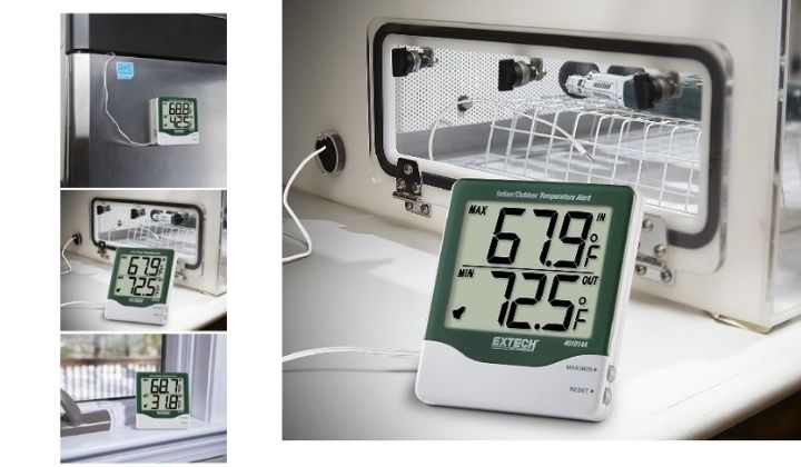 – Extech 401014A: Khác với các dòng trên, model này tập trung sâu vào đo nhiệt độ Indoor/Outdoor. Với đầu dò chống thấm nước dài gần 3 mét, bạn có thể luồn dây qua khe cửa để đo nhiệt độ ngoài trời hoặc đo trong bể chất lỏng, trong khi nhiệt độ phòng vẫn hiển thị rõ ràng trên thân máy chính.