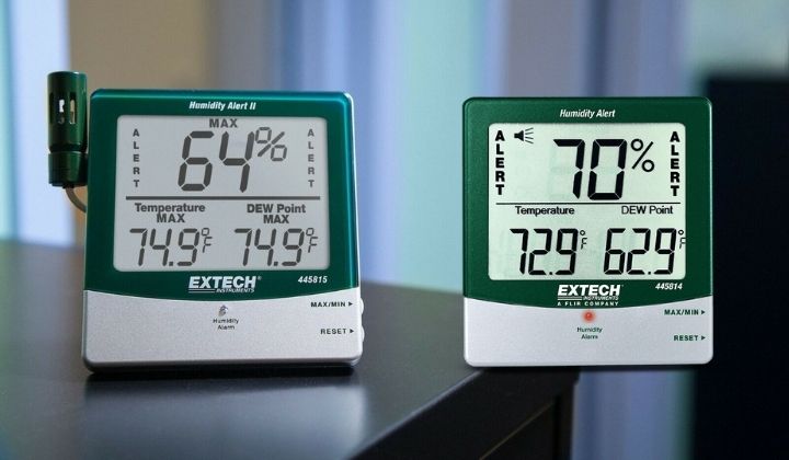 – Extech 445814: Điểm đặc biệt của model này là tính năng Humidity Alert. Bạn có thể cài đặt ngưỡng độ ẩm mong muốn, máy sẽ phát cảnh báo bằng đèn LED và âm thanh khi độ ẩm vượt ngưỡng. Đây là chiếc nhiệt ẩm kế để bàn Extech lý tưởng cho các kho lưu trữ hồ sơ, giấy tờ.
