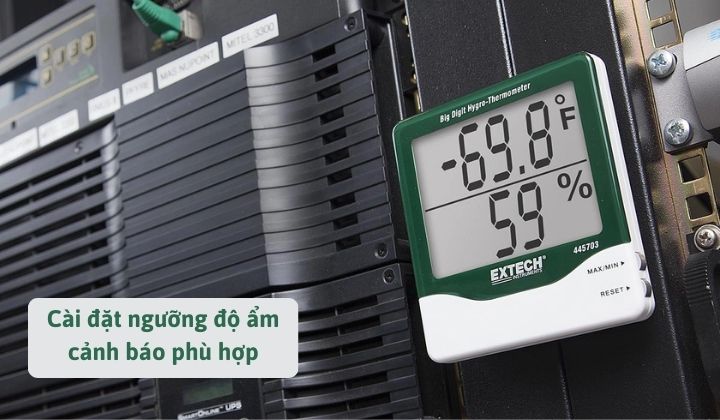 Bước 2: Điều chỉnh ngưỡng độ ẩm (ví dụ 60% cho kho dược) bằng các nút mũi tên.